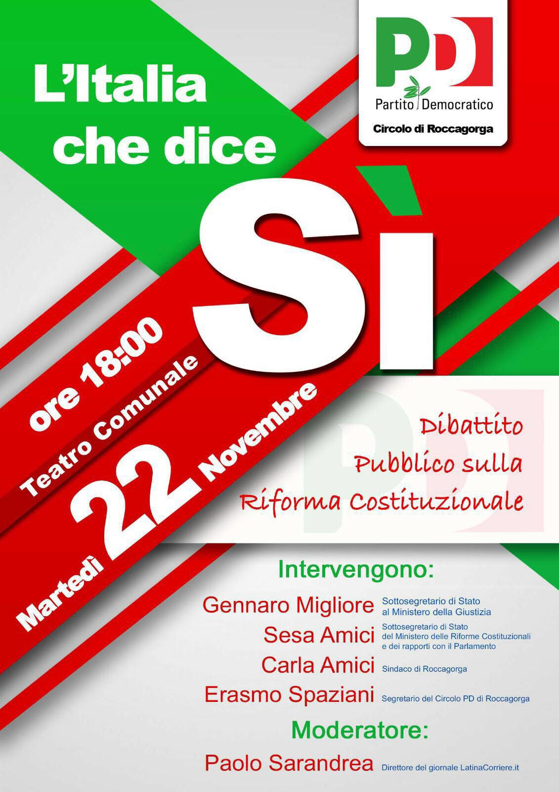 L’Italia che dice sì. E’ questo il titolo di un dibattito pubblico promosso dal circolo di Roccagorga del Partito democratico sul referendum che si svolgerà il prossimo 4 dicembre. L’appuntamento è fissato per le ore 18 presso il teatro comunale del paese lepino. Interverranno il Sottosegretario di Stato al Ministero della Giustizia, Gennaro Migliore, il Sottosegretario alle Riforme Costituzionali e Rapporti con il Parlamento, Sesa Amici, il sindaco di Roccagorga Carla Amici e il segretario del circolo Pd di Roccagorga Erasmo Spaziani. A coordinare i lavori sarà il giornalista Paolo Sarandrea.