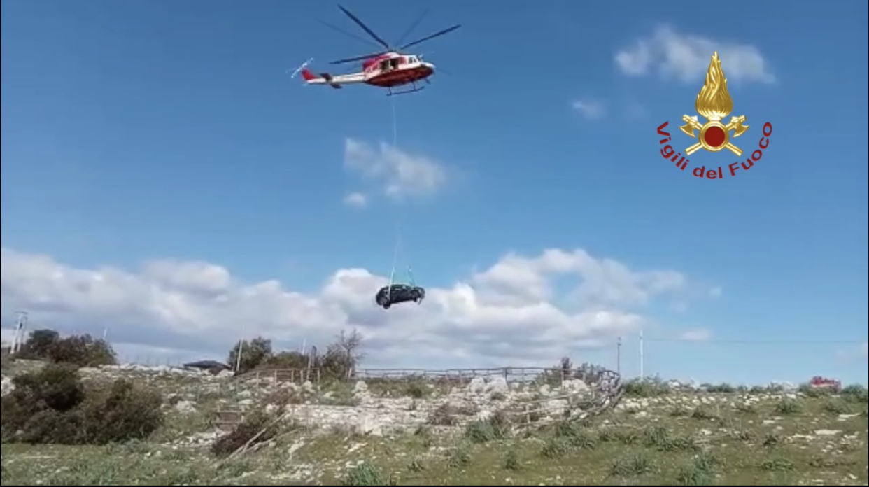 Il recupero è stato eseguito da un elicottero del reparto volo dei Vigili del Fuoco che con una manovra complessa hanno recuperato il mezzo incidentato.