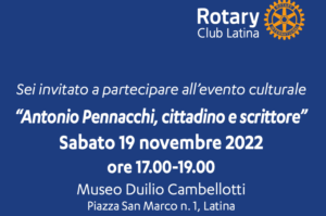 ”Prosegue l’impegno del Rotary Club Latina – spiega il presidente Antonio Currà – nel portare il Rotary nella città, ed ispirare giovani e non più giovani ad avere impegno civile e visione attraverso gli esempi che vengono loro proposti. Antonio Pennacchi, al di là del ruolo di primo piano che ha saputo ricoprire nella cultura letteraria italiana del nostro tempo, rappresenta un esempio di coerenza, di impegno, di convinzioni autentiche e non di facciata. Il Rotary Club si propone come promotore di cultura, alla ricerca del contatto con il cittadino, un club testimone di valori condivisi”.