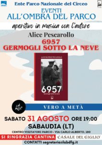 I prossimi appuntamenti sono previsti per oggi e domani in via Carlo Alberto 180 (Centro visitatori Parco – Sabaudia), entrambi alle ore 19:00. Le serate saranno animate dalla musica di Vero a metà, una cover band di Pino Daniele che ha appena celebrato 20 anni di carriera con esibizioni in tutta Italia. Oggi verrà presentato il libro “Sulle orme di Circe” di Stefano Orsini mentre domani “6967: Germogli sotto la neve” di Alice Pescarollo , entrambi pubblicati da Lab DFG.
