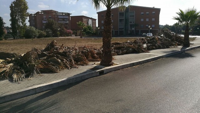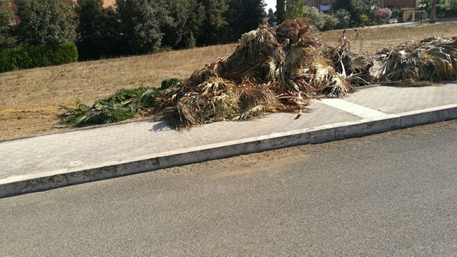La manutenzione del verde pubblico a Sabaudia passa per i marciapiedi. Una settimana fa è stata eseguita la potatura delle palme che si trovano in via Luigi Tenco, ma dopo l’intervento effettuato dalla ditta incaricata lo “scarto” è rimasto a terra impegnando tutto il marciapiede. L’operazione è stata eseguita nei pressi del nuovo Conad super-store. Il nostro lettore, che ci ha segnalato con foto il disservizio, si chiede quanto tempo ancora rami e foglie secche debbano mettere a rischio l’incolumità dei pedoni e arrecare una brutta immagine al quartiere. E’ prevista una sanzione?