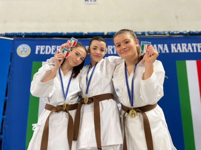 Benedetta Pandoli, Martina Coriddi, Martina Carluccio, KUMITE TEAM 13/14 anni da Bianca a Marrone Open Femminile