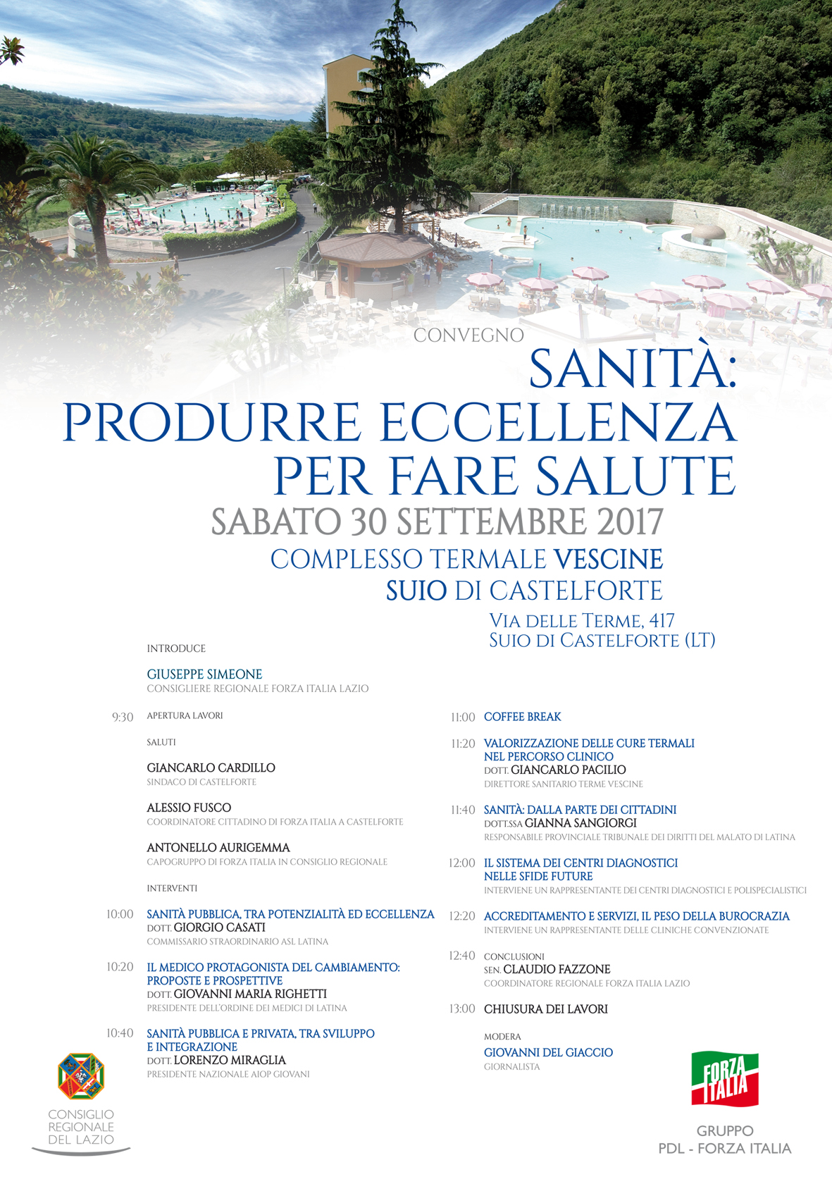Si terrà sabato 30 settembre 2017, dalle 9:30 alle 13, il convegno sul tema “Sanità: produrre eccellenza per fare salute” organizzato dai consiglieri regionali di Forza Italia. L’evento avrà luogo a Castelforte, presso il Complesso Termale Vescine. Il tema dell’evento riguarda il rapporto tra sanità pubblica e privata e punta, attraverso l’intervento di esperti qualificati del settore tra cui il commissario straordinario della Asl di Latina, Giorgio Casati, un rappresentante dell’Ordine dei medici di Latina, il presidente nazionale di Aiop Giovani, Lorenzo Miraglia, il direttore sanitario delle Terme Vescine, Giancarlo Pacilio, la responsabile provinciale del tribunale dei diritti del malato di Latina, Gianna Sangiorgi, un rappresentante dei Centri diagnostici polispecialistici ed un rappresentante delle cliniche convenzionate, ad affrontare i temi e le prospettive inerenti l’integrazione e lo sviluppo di servizi e prestazioni nell’interesse della collettività. Chiuderà gli interventi il coordinatore regionale di Forza Italia Lazio, senatore Claudio Fazzone.