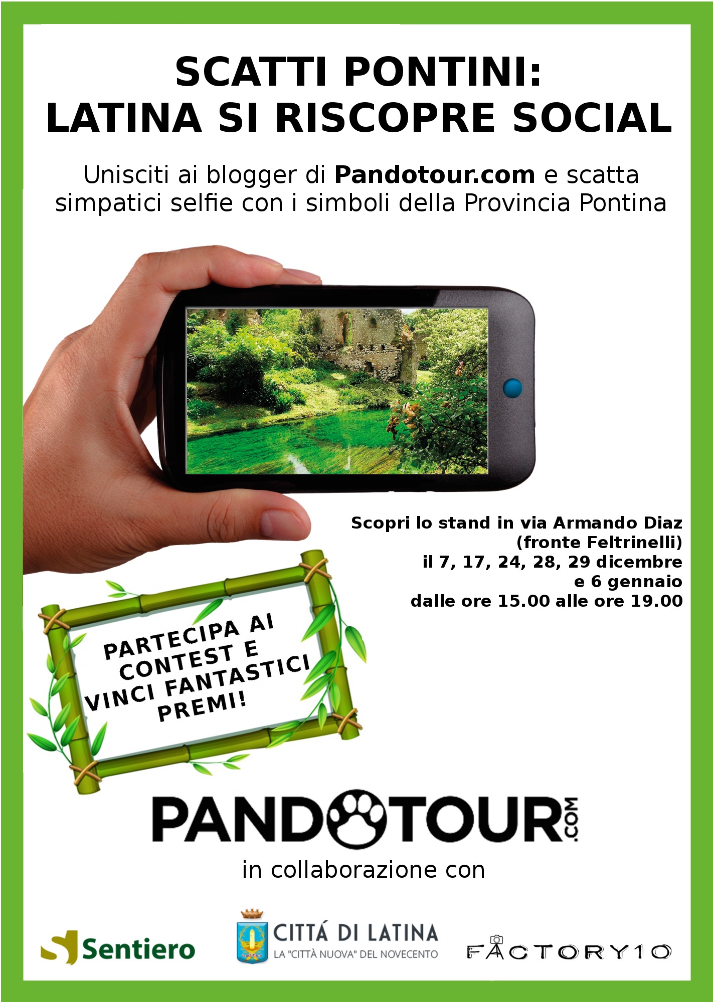 L’iniziativa, che vede la collaborazione del Comune di Latina, il Sentiero e Factory10, nasce con lo scopo di utilizzare i nuovi strumenti di comunicazione per promuovere le bellezze del territorio pontino attraverso la condivisione di foto sui principali social network. Tra un giro di shopping e una passeggiata in centro, i cittadini potranno fermarsi sotto lo stand e posare all’interno di una cornice creata appositamente per l’occasione. A loro disposizione troveranno dei gadget originali ritraenti i simboli della Provincia Pontina. Gli scatti verranno poi pubblicati sulla pagina Facebook ufficiale di Pandotour e condivisi sui profili degli utenti, in modo da diventare più virali possibili.