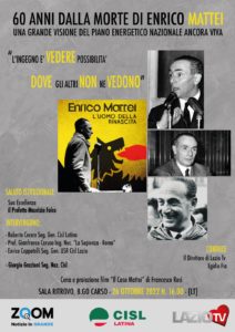 In occasione dei 60 anni della scomparsa di Enrico Mattei, il fondatore e presidente di Eni, si terrà a Latina un evento organizzato dalla Cisl, mercoledì 26 ottobre prossimo alle ore 16, presso il ristorante ‘Il Ritrovo’ di Borgo Carso.