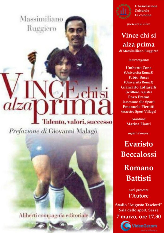 Un incontro con i campioni dello sport di ieri e di oggi per presentare il libro di Massimiliano Ruggiero ‘Vince chi si alza primo’. Questo libro traccia un identikit credibile del ‘campione’ che eccelle in una determinata disciplina raggiungendo,nel contempo,visibilità e apprezzamento sociale. L’autore,manager ed ex giocatore di rugby in serie A, demolisce tutti i luoghi comuni, che vogliono il campione essere l’espressione di ‘genio e imprevedibilità’, così come la convinzione che le vittorie siano esclusivamente il frutto dell’applicazione metodica di regole e norme di condotta, tutte improntate al sacrificio e alla disciplina. Presenti all’interno del libro interviste a personaggi di successo del mondo dello sport e non solo. Saranno presenti all’incontro, oltre all’autore, Umberto Zona e Fabio Bocci(università roma3)che affrontano la figura del campione sotto un profilo psicologico, pedagogico e antropologico, il Prof.Giancarlo Loffarelli (docente di Storia e Filosofia), Enzo Eramo (assessore allo sport) e Emanuele Pierotti (Palestra Sport Village). Ospiti d’onore Evaristo Beccalossi (ex giocatore dell’inter campione d’Italia 1980) e Romano Battisti (campione olimpionico di canottaggio) 2 campioni di epoche diverse che ci racconteranno la loro storia nello sport e nella vita. Coordina l’incontro la dott.ssa Marina Eianti. Il ricavato dell’evento ( organizzato dall’associazione culturale LE COLONNE)verrà devoluto al comune di Amatrice ‘adottiamo un monumento’ teatro comunale di Amatrice. L’appuntamento è presso la Sala Sport sotto alle tribune dello stadio “Tasciotti” di Sezze, alle 17,30, martedì 7 marzo.