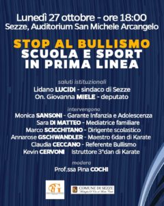 A Sezze, lunedì 27 ottobre ore 18 presso l’Auditorium San Michele Arcangelo, ci sarà il convegno dal titolo “Stop al Bullismo: Scuola e Sport in prima linea” organizzato dal Comune di Sezze insieme al Garante dell’infanzia e dell’adolescenza della Regione Lazio, grazie all’iniziativa del consigliere comunale Orlando Santoro e Kevin Cervoni.