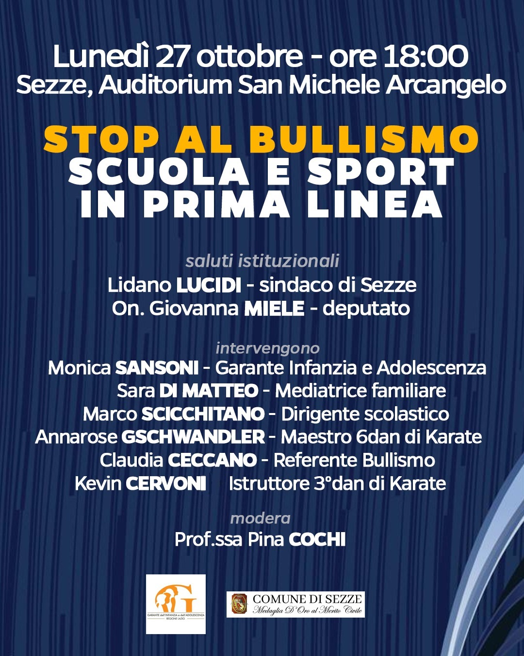 A Sezze, lunedì 27 ottobre ore 18 presso l’Auditorium San Michele Arcangelo, ci sarà il convegno dal titolo “Stop al Bullismo: Scuola e Sport in prima linea” organizzato dal Comune di Sezze insieme al Garante dell’infanzia e dell’adolescenza della Regione Lazio, grazie all’iniziativa del consigliere comunale Orlando Santoro e Kevin Cervoni.
