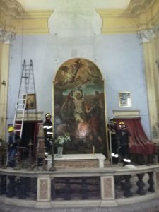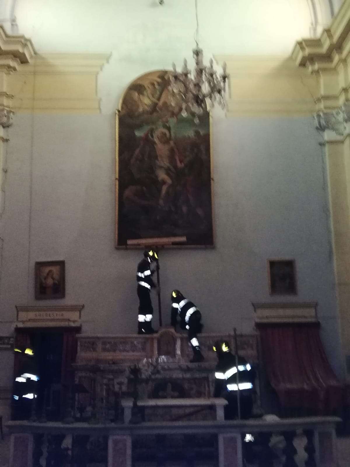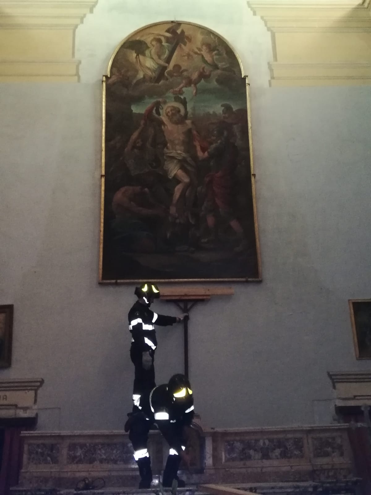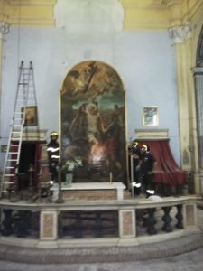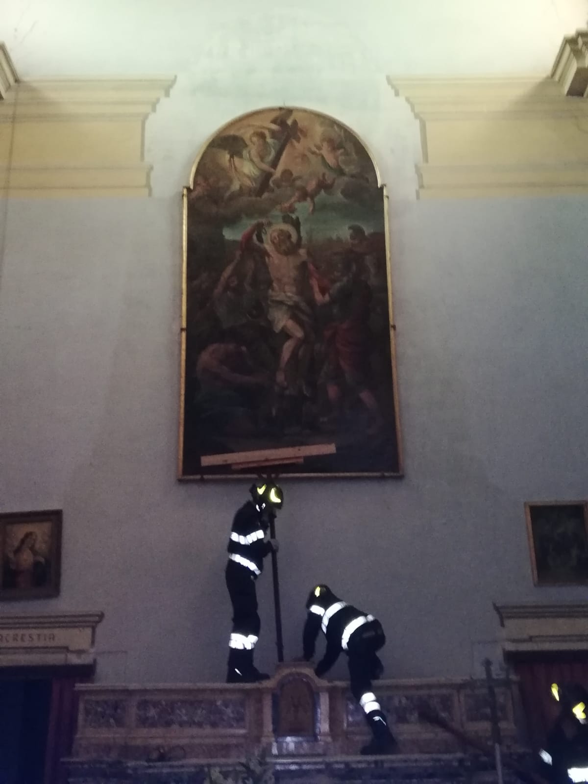Brillante operazione di salvataggio quella condotta oggi dai Vigili del Fuoco a Sezze. Gli uomini della centrale di Latina hanno infatti messo in salvo un’opera d’arte, ovvero il quadro dietro l’altare della chiesa di Sant’Antonio, che era rimasto in balia degli eventi e degli agenti atmosferici ormai da anni, gli stessi nei quali la chiesa è stata chiusa perché a rischio crollo e quindi inagibile. La chiesa costituisce parte integrante dell’ala vecchia dell’ex ospedale San Carlo che è anch’essa chiusa dal luglio 2016. Il personale del Comando Provinciale dei Vigili del Fuoco di Latina ha provveduto ad effettuare il recupero di un’importante opera situata nella chiesa di San Bartolomeo a Sezze, sotto l’attenta supervisione della Prefettura di Latina e personale del Mibact. Mentre il Comune di Sezze ha fornito mezzi ed assistenza. Sul posto infatti è intervenuto personalmente il responsabile dell’ufficio Tecnico che ha fornito ai vigili del fuoco ogni supporto operativo per procedere al trasferimento in sicurezza della tela.