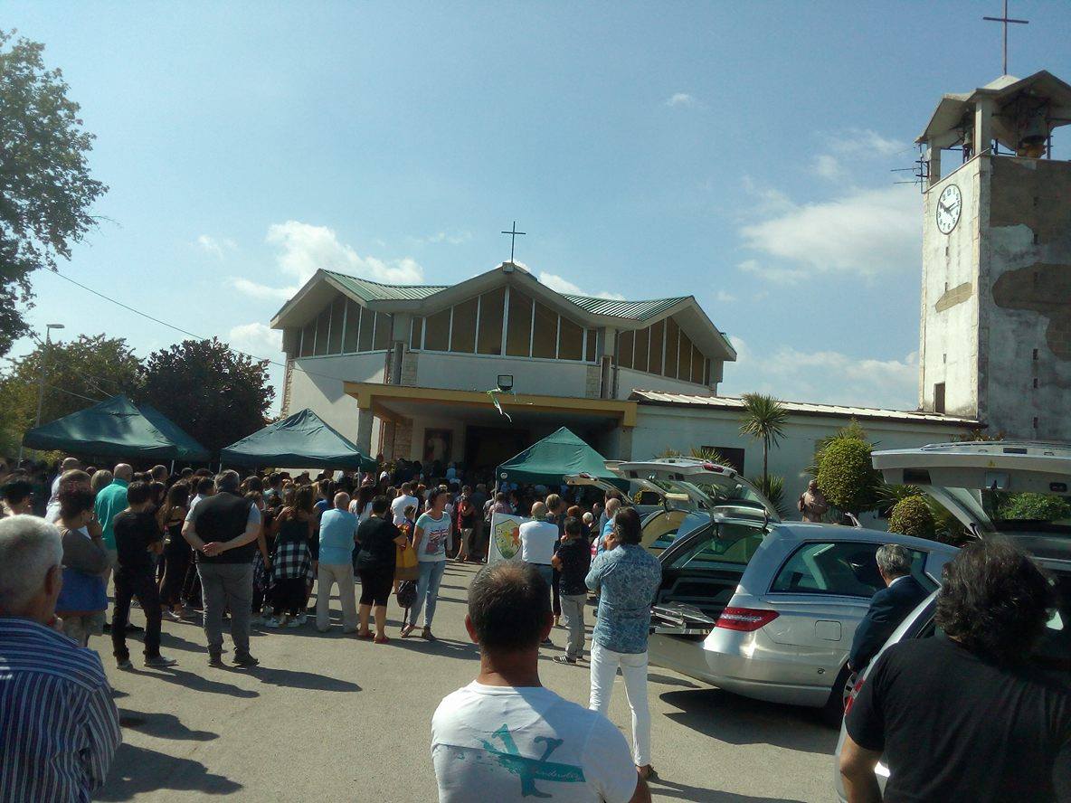 A dare l’ultimo saluto ad Angela, 12 anni, ai suoi genitori e allo zio Paolo, morti con i crolli del 24 agosto ad Amatrice, l’intera comunità setina che in questi giorni ha vissuto il profondo lutto per la perdita di questa famiglia che sebbene “forestiera” si era perfettamente integrata nella vita sociale del centro collinare, il sindaco Andrea Campoli e il comandante della Polizia Locale Lidano Caldarozzi, il Prefetto e il presidente della Provincia di Latina, Pierluigi Faloni ed Eleonora Della Penna, il comandante della stazione dei carabinieri di Sezze, il luogotenente Mattia Benvenuto e il comandante provinciale della Guardia di Finanza, il colonnello Giovanni Reccia. Gremita la chiesa dei Santi Bartolomeo e Rocco, parrocchia di appartenenza della famiglia Dell’Otto nel quartiere Colli. All’uscita delle salme dalla chiesa parrocchiale sono stati liberati una nuova di palloncini bianchi per accompagnare in Cielo la piccola Angela.