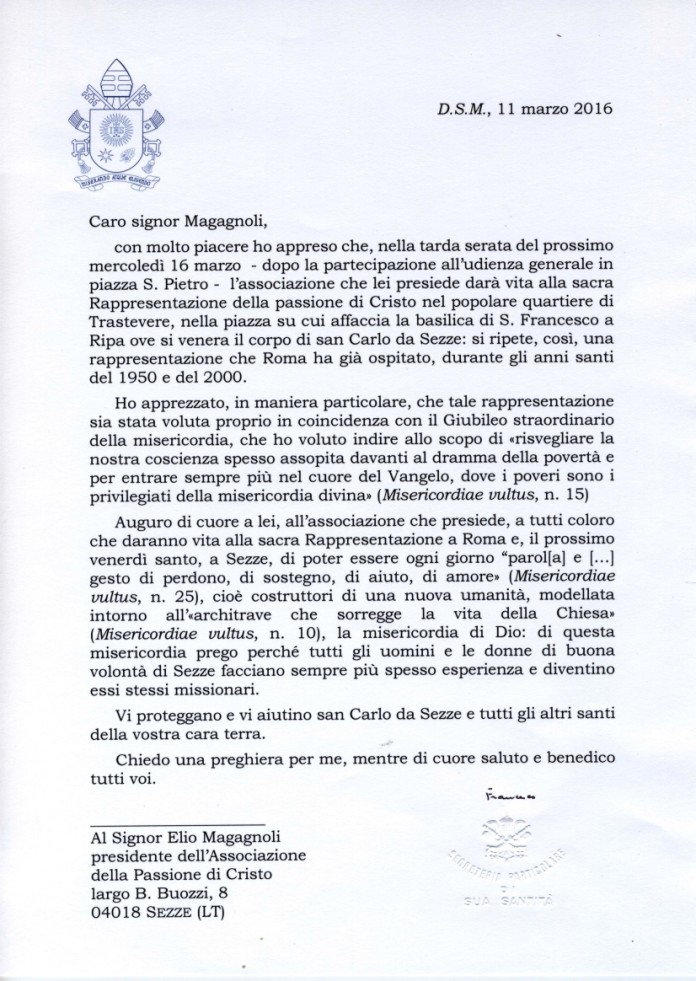 Una lettera firmata personalmente da Papa Francesco inviata al presidente dell’Associazione della Passione di Cristo di Sezze, Elio Magagnoli, per salutare tutta la struttura in vista della Rappresentazione straordinaria in programma domani sera a Roma, e di quella tradizionale del venerdi’ santo di Sezze.