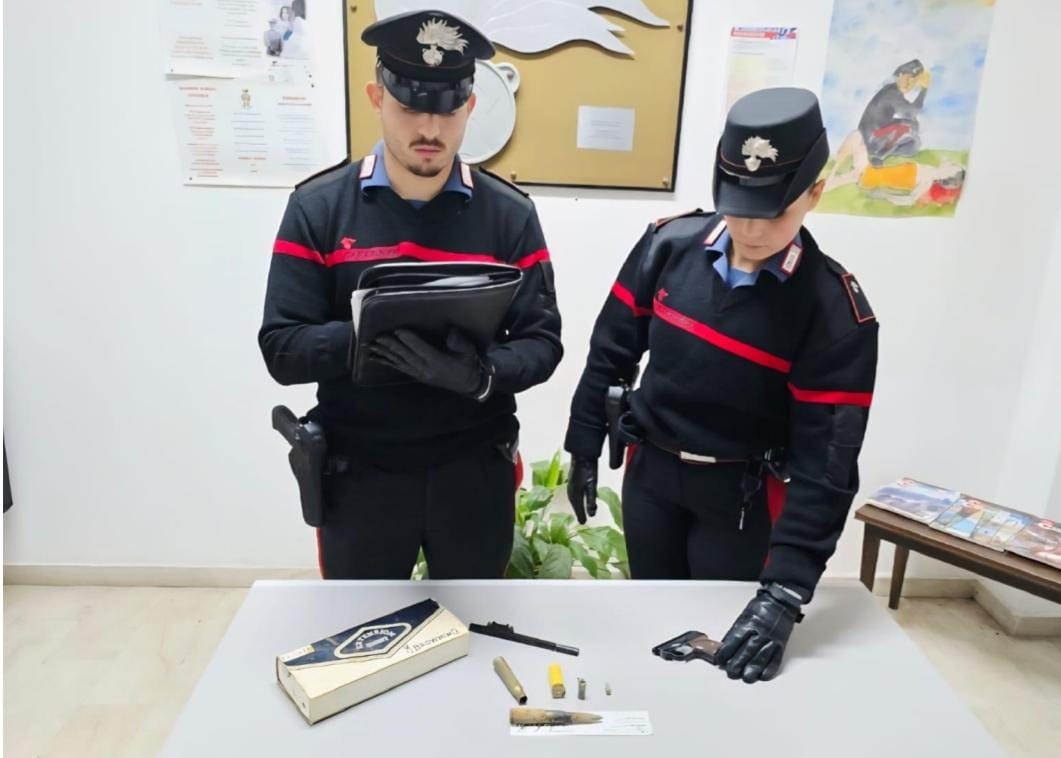 La perquisizione personale ha portato al ritrovamento di una pistola calibro 22 con matricola abrasa. Nella successiva ispezione domiciliare i Carabinieri hanno sequestrato una slitta per fucile, cartucce calibro 12 e 12,7, un’ogiva calibro 5.56 e bossoli dello stesso tipo, materiale considerato anche da guerra.