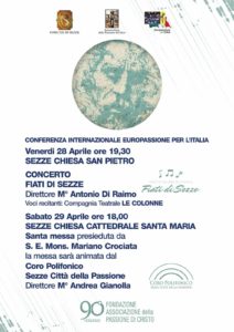 Tra gli eventi aperti al pubblico, il concerto di venerdì 28 aprile, alle 19,30, nella chiesa di San Pietro, eseguito dai “Fiati di Sezze”, diretti dal maestro Antonio Di Raimo, e la Santa Messa di Sabato 29 aprile, alle 18,00, nella cattedrale di Santa Maria, presieduta dal Vescovo Mariano Crociata e cantata dal “Coro Polifonico – Sezze Città della Passione”, diretto dal maestro Andrea Gianolla.
