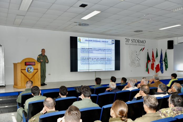 Il costante aumento del volume di traffico aereo, sia nel campo civile del Volo da Diporto o Sportivo (VDS) ed in considerazione del fatto che il 70° Stormo, come scuola di volo, si pone sempre più un punto di riferimento per il sistema paese nella selezione e l’addestramento dei futuri piloti, rende più attuale la potenzialità delle collisioni in volo, con conseguente necessità di intraprendere ogni possibile azione idonea ai fini della prevenzione. Alla luce di questi fattori, il meeting, dopo il saluto di benvenuto da parte del Comandante del 70° Stormo Colonnello Giuseppe BELLOMO, ha dato spazio ad interventi del personale dello Stormo qualificato Sicurezza Volo (SV) e Air Traffic Management (ATM), mirati ad evidenziare le peculiarità dello spazio aereo pontino e a fornire un’analisi dei conflitti di traffico registrati localmente nel corso degli ultimi anni.