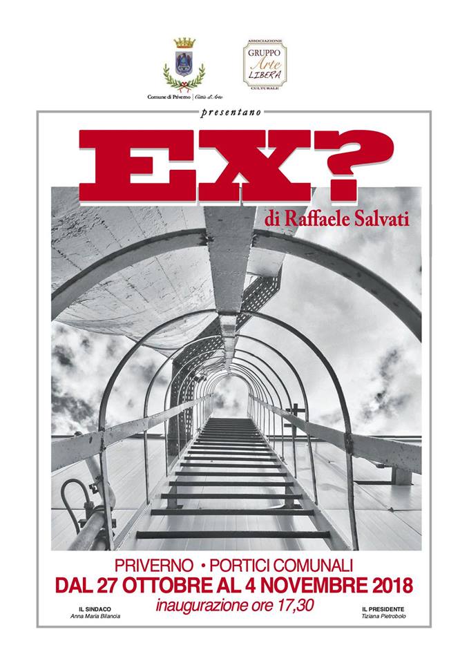 Sabato alle 17,30 sotto i portici comunali di Priverno sarà inaugurata la mostra fotografica di Raffaele Salvati dal titolo “EX?”. L’esposizione, organizzata dall’associazione “Gruppo Arte Libera” e programmata fino al 4 novembre, è composta da 18 immagini in bianco e nero scattate in diverse zone industriali del Sud Italia, frequentate dall’autore per il suo lavoro di ingegnere chimico. Con questo progetto l’artista di origini tarantine intende mostrare i tratti di strutture complesse trasmettendo volutamente il dubbio sulla natura dei luoghi fotografati.