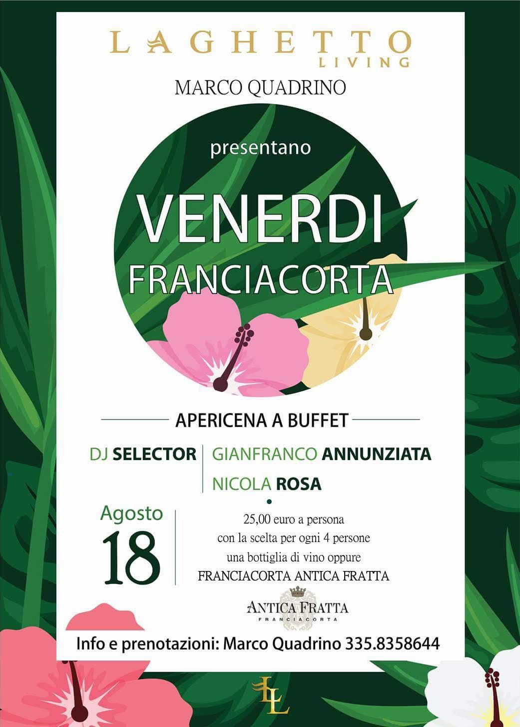 Dopo la divagazione in tema con il ferragosto di lunedì 14, dove il Laghetto Living ha registrato uno straordinario sold out, torna il “Venerdì Franciacorta” presentato dal team del Laghetto e da Marco Quadrino. Una serata unica, venerdì 18 agosto dalle 21, che sta caratterizzando il divertimento di un target di pubblico vasto. Famiglie che partecipano con trasporto ad un evento pensato e realizzato per loro. Cibo di qualità dello chef Antonio Di Luca e la grande accoglienza che solo il Laghetto Living sa dare. Cornice di questa magnifica serata la colonna sonora curate dai dj Gianfranco Annunziata e Nicola Rosa. Un mix dei migliori brani degli ultimi quarant’anni che si mescolano proponendo emozioni e suggestioni al pubblico. I balli di un tempo che si alternano a quelli più recenti. Come non ricordare la scenografia naturale del luogo, nella quale si innesta perfettamente quella creata appositamente da Tiziana Lippa. La festa prende il nome dal Franciacorta che è il suo main sponsor. Il cibo è curato, come sempre, dallo chef Antonio De Luca. Info e prenotazioni 3358358644.