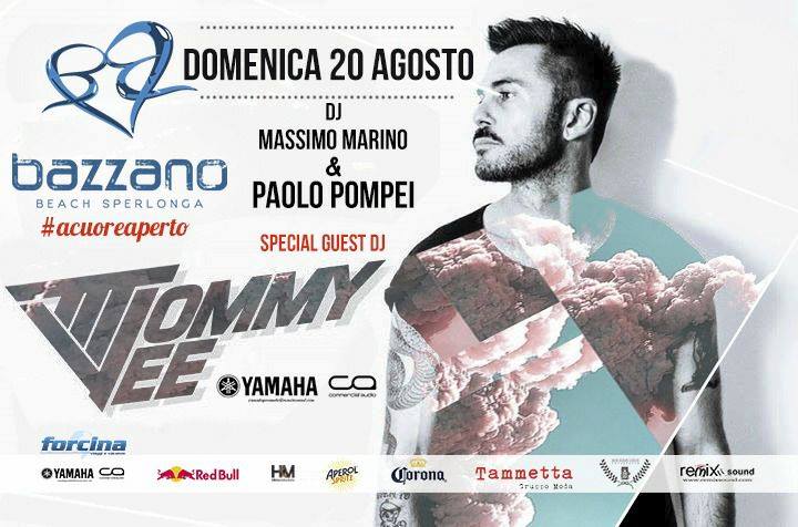 Un session sunday fuori dagli schemi domenica prossima (20 agosto) a Bazzano Beach, Sperlonga. Il lido che nel fine settimana realizza da giugno ai primi di settembre l’aperitivo più seguito della costa tirrenica, ospita una vera e propria star della consolle: Tommy Vee. Grazie alla collaborazione con Yamaha Commercial Audio, sponsor tecnico della location, Bazzano Beach ha il piacere di presentare per la prima volta un’artista della consolle dinamico e brillante, che negli anni ha saputo ritagliarsi un posto ben preciso nel mondo del clubbing internazionale. Tommy Vee infatti arriverà a Sperlonga dopo la data al Blue Marlin di Ibiza, in una sorta di gemellaggio ideale tra due mete turistiche di rilievo. Con lui il dj Paolo Pompei, dj storico della night life romana, oggi direttore artistico di uno dei club più importanti d’Italia come il Room 26 di Roma. Apre Massimo Marino vero e proprio residence di Bazzano Beach. Gli eventi di Bazzano Beach sono organizzati con la collaborazione di: Yamaha commercial audio, Tammetta Gruppo Moda, Corona, Red Bull, Remix Sound, Forcina Viaggi, H&M productions. Bazzano Beach, via Flacca, Sperlonga.