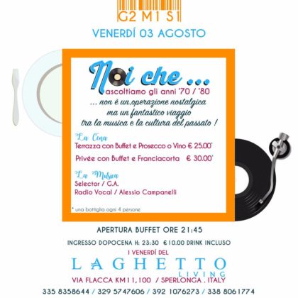 Dallo scorso venerdì l’evento “Noi che…” del Laghetto Living a Sperlonga è già un must. Gli ingredienti sono quelli migliori, per cenare, divertirsi e ballare sui ricordi di centinaia di hits. Venerdì 3 agosto il buffet, pensato e realizzato dallo chef Antonio Di Luca si apre alle 21.45 con il sottofondo musicale a tema, poi via alle danze con la musica evergreen del Dj G.A. e la voce di Alessio Campanelli. L’evento si svolge sulla bellissima e suggestiva terrazza del Laghetto Living e sarà possibile accedere anche dopo cena per un drink. Laghetto Living Via Flacca, Km 11.100, Sperlonga. Info: 3388358664 – 3295747606 – 3921076273 – 3388061774