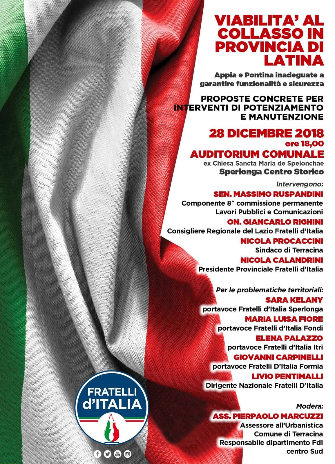 Il 28 dicembre, alle ore 18,00, presso l’Auditorium Comunale del Centro Storico ex chiesa Sancta Mariae de Spelonchae, il circolo cittadino di Fratelli d’Italia di Sperlonga ospiterà i vertici del partito per presentare delle proposte concrete per la definitiva soluzione dei problemi relativi alla viabilità. “Il coordinatore del Dipartimento di Fratelli D’Italia Sud Pontino, Assessore Marcuzzi di Terracina, d’intesa con tutti i portavoce del partito del Sud Pontino, ci ha chiesto disponibilità a fare da raccordo logistico per un momento di confronto importante” dichiara Sara Kelany, portavoce del circolo di FdI – Sperlonga “Ci siamo messi a disposizione piena perché la soluzione delle problematiche della mobilità per la provincia di Latina ed in particolare per tutto il sud pontino, non è più differibile, ne va della sicurezza degli utenti e della tutela delle nostre realtà produttive”. Saranno presenti all’evento, tra le autorità, il Senatore Massimo Ruspandini, componente dell’ottava commissione permanente Lavori Pubblici e Comunicazioni del Senato, il Consigliere Regionale Massimo Righini, il Sindaco di Terracina Nicola Procaccini e il Presidente Provinciale di Fratelli d’Italia Nicola Calandrini. I portavoce del partito di tutto il sud pontino porteranno le testimonianze relative alle problematiche territoriali.