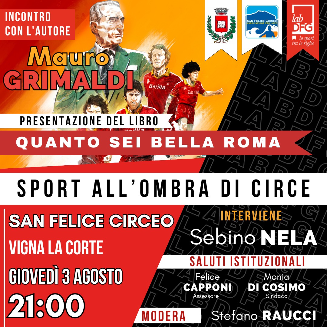 Domani saranno protagonisti una ex gloria della Roma come Sebino Nela e Mauro Grimaldi, autore del libro Quanto sei bella Roma, che ripercorre il campionato vinto nel 1982-1983, quello del secondo Scudetto della storia del club. A 40 anni dal trionfo, nelle pagine dell’opera edita dalla Lab DFG, vengono narrati i fatti che anticiparono e seguirono la cavalcata. Le emozioni di ieri tornano per magia come se il tempo non fosse mai passato, restituendo quell’amore puro che appartiene al “core” dei tifosi giallorossi. Un libro non solo per chi c’era, ma anche per le generazioni successive e per tutti gli appassionati di calcio e di sport, ai quali, come al solito, Mauro Grimaldi propone uno spaccato di storia e di vita, che aiuta a comprendere meglio i fatti del campo.