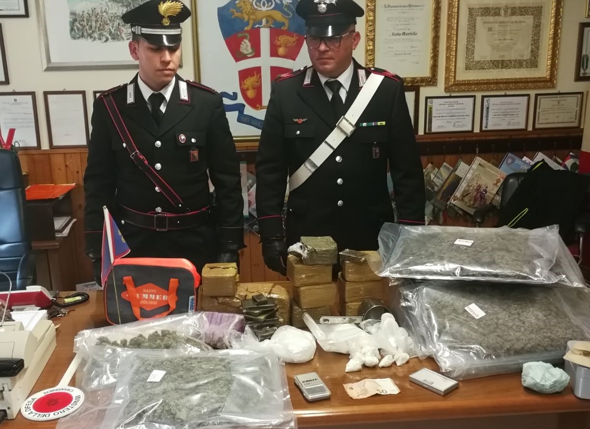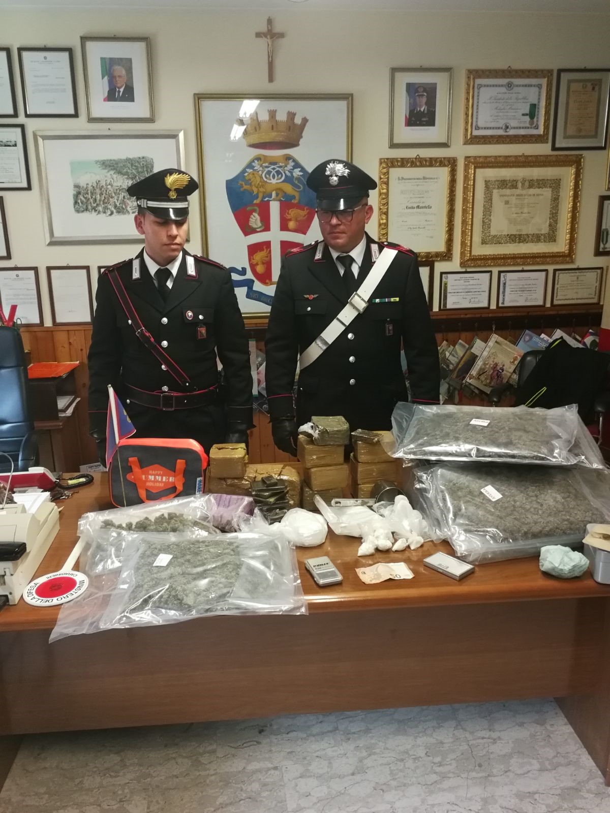 A seguito delle perquisizioni effettuate nell’immediatezza degli arresti, i carabinieri della tenenza hanno rinvenuto nell’abitazione del più giovane: 10,6555 chilogrammi di hashish, suddivisi in 105 panetti, 6,280 chili di marijuana suddivisi in undici confezioni e 867 grammi di cocaina suddivisi in sei involucri di vario peso, due bilancini di precisione, sostante da taglio e 50 euro. Il tutto è stato posto sotto sequestro compresa la droga ingerita e recuperata successivamente, consistente in 23 grammi di marijuana.