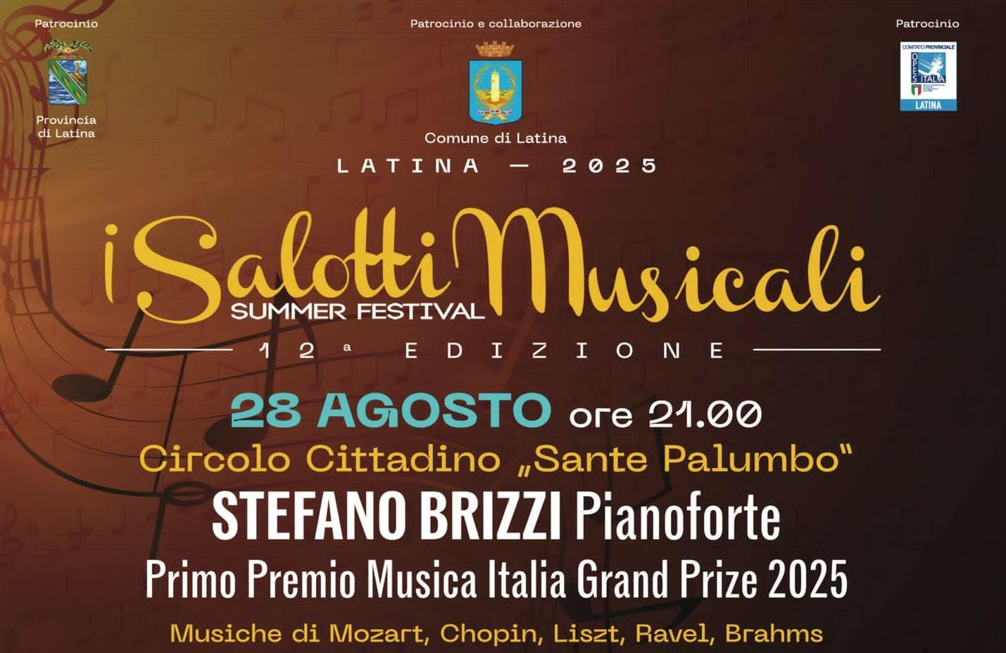 Si chiude con il pianoforte l’edizione 2025 de I Salotti Musicali, rassegna organizzata dall’Associazione Culturale Eleomai con il patrocinio e la collaborazione del Comune di Latina e di Opes Latina. L’ultimo appuntamento è fissato per giovedì 28 agosto alle ore 21, al Circolo cittadino “Sante Palumbo”, con protagonista il giovane talento Stefano Brizzi, fresco vincitore del Musica Italia Grand Prize 2025.