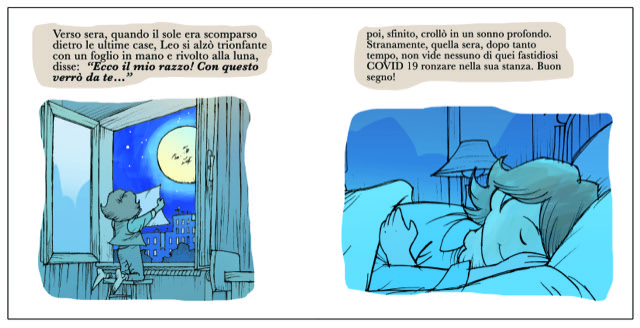 “Storia di Leo” racconta la vicenda del Covid attraverso gli occhi di un bambino. Come è nata l’idea? L’ispirazione l’ho presa dagli occhi disorientati dei bambini: ho cercato di immedesimarmi in loro, di interpretare i loro interrogativi di fronte a dei cambiamenti per molti versi incomprensibili anche a noi adulti. Chi è il signor COVID? Possibile che nessuno sappia che faccia abbia? Come fa ad essere presente, contemporaneamente in tutto il mondo? E come entra nelle case della gente anche se la porta è chiusa? Queste sono le domande che si pone Leo. In realtà i bambini assorbono come spugne e senza alcun filtro le notizie e cercano di dare a tutto questo una spiegazione logica in base ai parametri del quotidiano che conoscono. Leo, in questo caso, è un bambino fortunato perché si lega alla Luna e alla fantasia, grazie alla quale, anche se non può sconfiggere il COVID, può vincere la paura e neutralizzarlo, cacciandolo dai propri incubi e affrontando la vita di tutti giorni normalmente, perché tutto questo è una favola e come tutte le favole finisce (o finirà) bene.