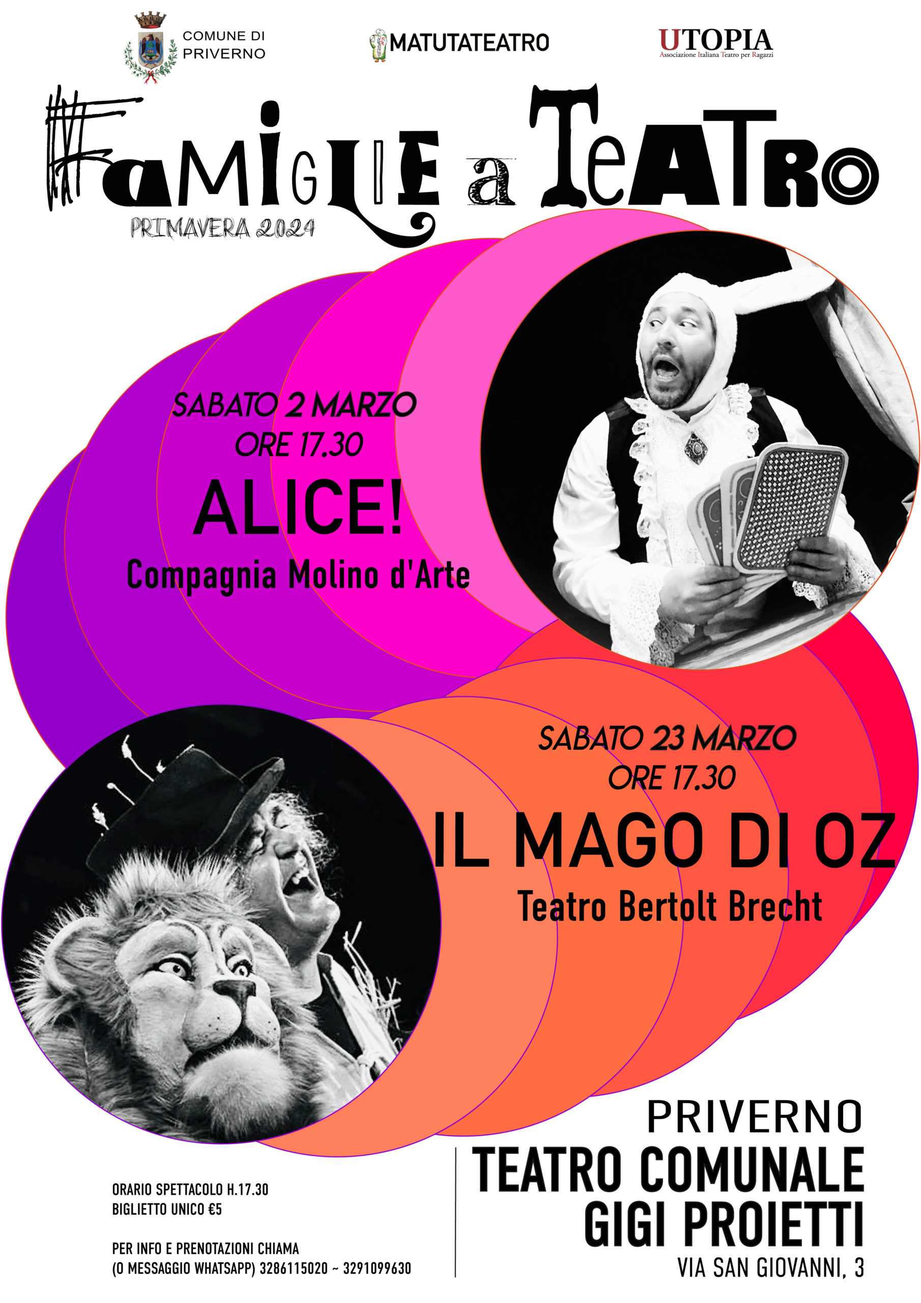 “Alice!” è uno spettacolo di attori e pupazzi. L’opera di Lewis Carrol, che fece dell’assurdità un nuovo codice di linguaggio per gli inglesi, viene da Molino d’Arte “smontata e rimontata affinché la famiglia a teatro possa scegliere il proprio pezzo di paese interno all’animo e farne una meraviglia”, come si legge nelle note di regia. Quattro attori – Filippo Giordano, Angela Borromeo, Noemi Alice Ricco, Luca Mastrolitti – interpreteranno più di una dozzina di personaggi, in persona e in pupazzi, in una panoramica di eventi non consueta in cui sarà possibile riconoscere ognuno dei personaggi della storia classica, ma in modo inaspettato. Scene di Rosa Guglielmi, costumi di Paola Creanza, testo di Antonella Petrera, regia di Antonello Arpaia.
