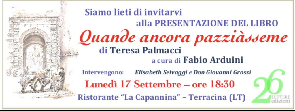 Si terrà lunedì 17 settembre alle ore 18.30 nelle sale del ristorante La Capannina a Terracina la presentazione ufficiale del libro “Quande ancora pazziàsseme” scritto da Teresa Palmacci, curato da Fabio Arduini e realizzato dalla casa editrice 26 Lettere. Il libro è un viaggio indietro nel tempo nella tradizione terracinese, per recuperare dal profondo della memoria collettiva e mettere bianco su nero quei momenti che nell’era della velocità e di Internet rischiano di perdersi. Un ritorno alle vite semplici e spensierate dei nostri nonni fatte di giochi e filastrocche, scherzi e marachelle che regalano sempre un melanconico sorriso. Teresa Palmacci è autrice e regista di commedie teatrali in dialetto terracinese. Ha debuttato come attrice a vent’anni nella compagnia teatrale di Vincenzo Pietricola, per poi continuare in quella di Ermanno Carsana e Genesio Cittarelli. Dal 1999 con la sua compagnia ‘La Cultura del Dare’ ha messo in scena ben dieci commedie che negli anni hanno riscosso grande successo e apprezzamento da parte del pubblico. Fabio Arduini è docente di lettere. Con il suo romanzo Bella prof! (Prospettiva Editrice, 2013) ha vinto il premio internazionale Giulio Cesare 2018. È autore di saggi storici. Alla presentazione interverranno, Elisabeth Selvaggi e Don Giovanni Grossi. Durante l’evento, Poste Italiane presenterà in occasione del Ventennale della Compagnia Teatrale “La Cultura del Dare”, di cui l’autrice del libro Teresa Palmacci è capocomico e regista, un francobollo postale dedicato a tale ricorrenza. L’ufficio postale di Terracina sarà infatti presente per l’annullo postale. Un’occasione davvero unica sia per i filatelici sia per chi parteciperà a tale evento perché, attraverso l’affrancamento, potranno acquistare e ricevere un ricordo della serata. Tutto il ricavato della vendita dei francobolli verrà destinano in beneficenza alla Mensa Caritas cittadina di Terracina.