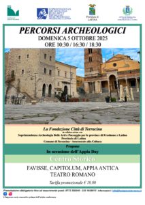 La due giorni culturale proseguirà domenica 5 ottobre con visite guidate al centro storico di Terracina. In tre turni (10.30, 16.30 e 18.30) il personale specializzato accompagnerà i visitatori tra Favisse, Capitolium, Appia Antica e Teatro Romano, con una tariffa promozionale di 10 euro. La prenotazione è obbligatoria e può essere effettuata telefonicamente o via mail presso la Fondazione.