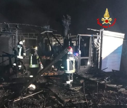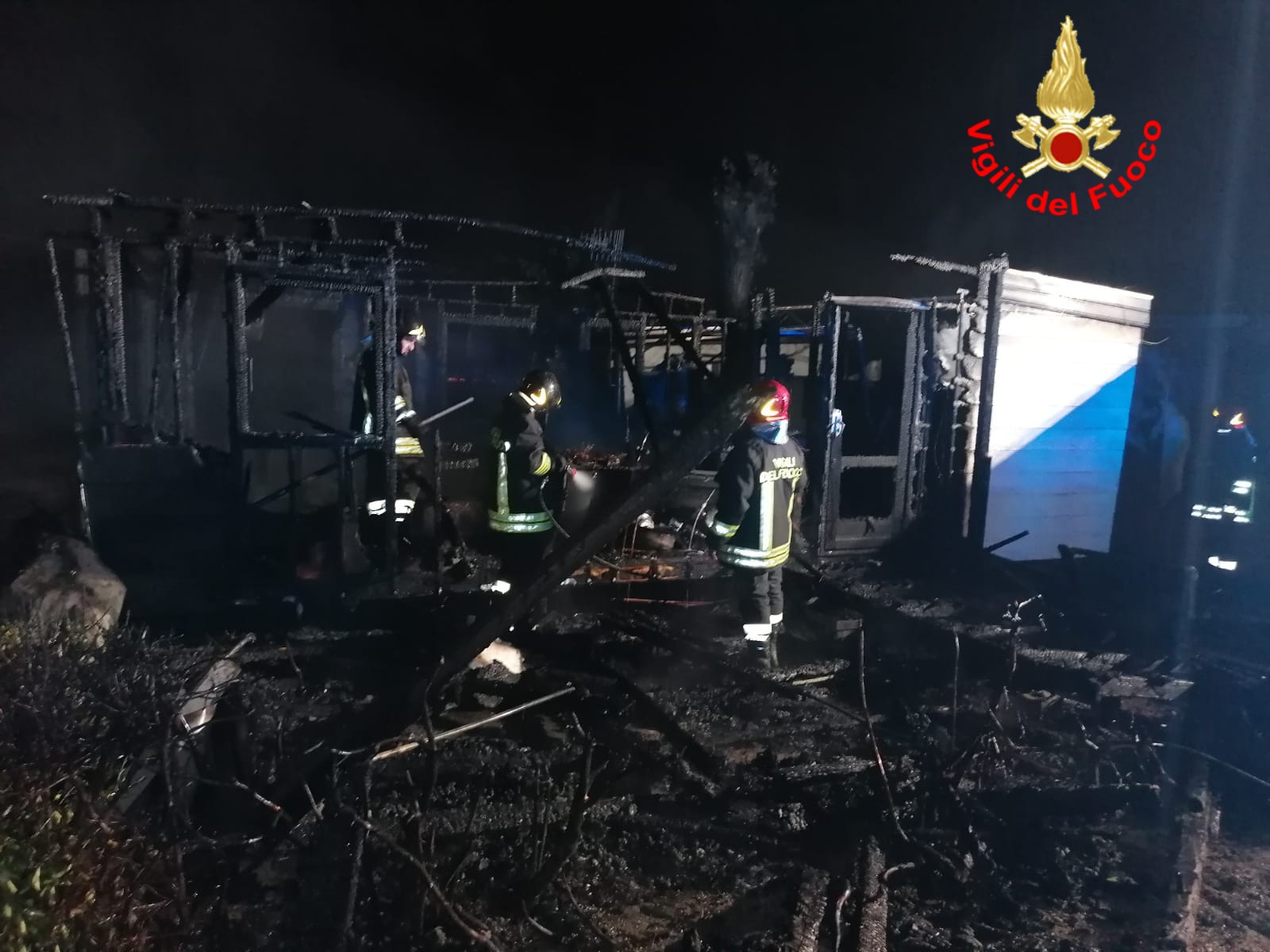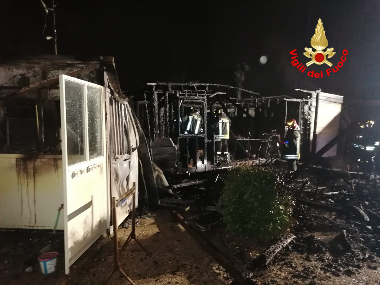 Incendio in un campeggio in via Badino, a Terracina. I vigli del fuoco sono intervenuti verso le 22.30 chiamati da qualcuno che aveva visto le fiamme.