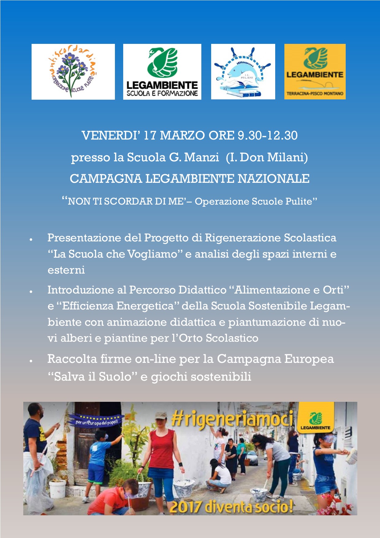 La campagna nazionale “Non ti scordar di me”, fa tappa a Terracina, dove il circolo di Legambiente promuove, sabato 17 marzo, presso la scuola Don Milani in via Zicchieri, dalle ore 9.30 alle ore 12.30, con l’intervento di volontari “rigeneratori”, una giornata dedicata alla rigenerazione degli spazi scolastici per una migliore vivibilità, che è il tema della campagna di quest’anno.