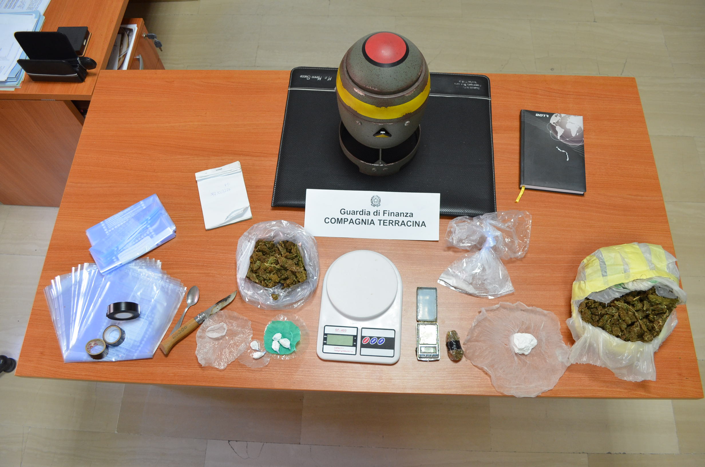 A questo punto gli uomini del capitano Daniele Signore, comandante della Compagnia della Guardia di Finanza di Terracina, hanno proceduto a perquisizione l’abitazione del 22enne C.S. dove sono stati rinvenuti e posti sotto sequestro 460 grammi di marijuana, 33 grammi di cocaina abilmente occultati all’interno di un contenitore di plastica, 13,20 grammi di sostanza da taglio del tipo mannite, due bilancini elettronici di precisione, un coltello e materiale per il confezionamento (nastro adesivo e numerosi involucri in cellophane), oltre alla droga trovata addosso al giovane.