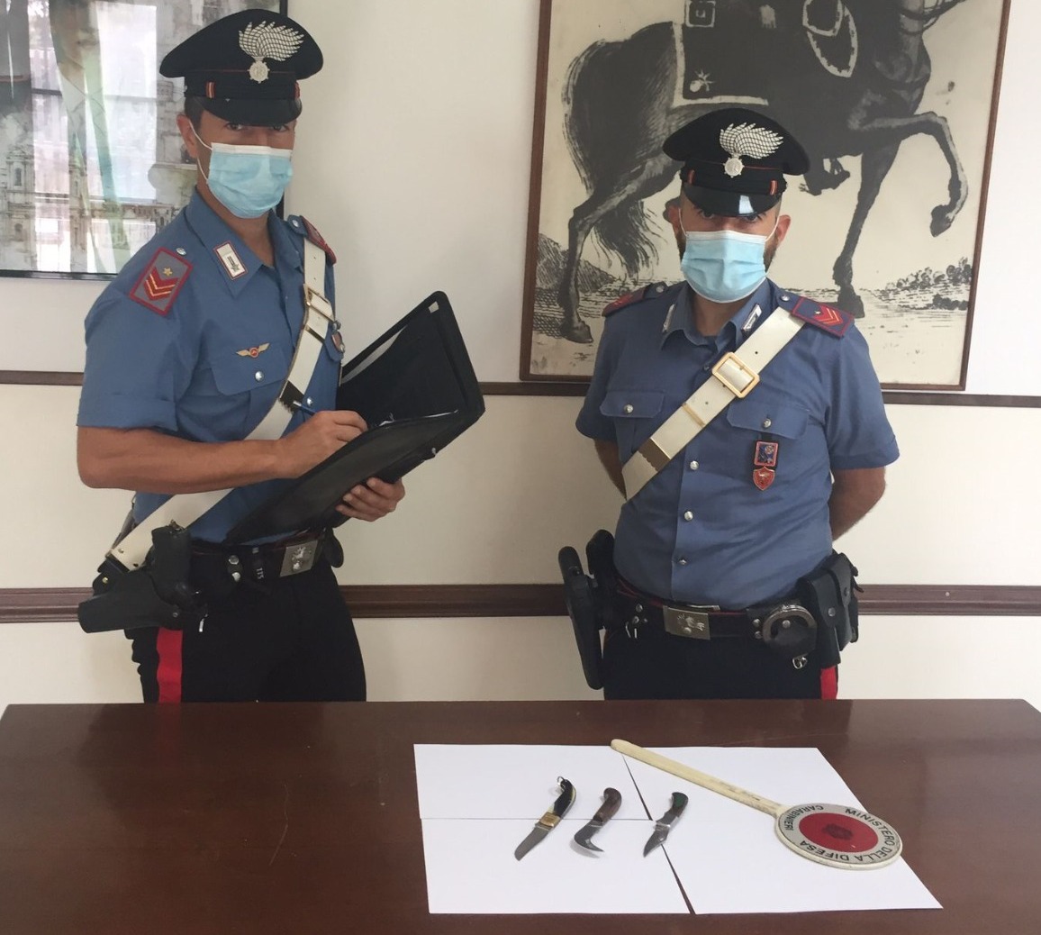 Tempestivamente inseguito e fermato, i Militari dell’Arma hanno poi trovato nell’auto del giovane tre coltelli di cui due a serramanico e una roncola, il tutto posto sotto sequestro.