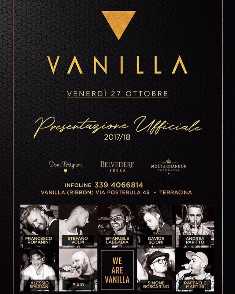 Nella provincia pontina che presenta eventi solo ed esclusivamente il sabato sera, finalmente nasce, anzi riprende, una one night che nel passato aveva seminato e poi raccolto un grande successo di venerdì. Grazie a Paolo Baccolini e Lorenzo Principe, curatori di pubbliche relazioni in diverse location tra il capoluogo e Terracina, riprende vita, dopo diverso tempo, Vanilla, la festa del venerdì appunto nella location del Ribbon, proprio a Terracina. Il 27 ottobre si presenta così, ufficialmente, Vanilla stagione 2017/2018. Format completamente rivisitato, che guarda ad un parco artisti molto ampio, tra i quali i dj: Francesco Romanini, Stefano Volpi, Emanuele Labadia, Davide Scioni, Andrea Papitto e Alessio Spaziani. I vocalist: Bixio, Simone Boscarino e Raffaele Martini. Sono questi gli ingredienti salienti del Vanilla, conditi poi con l’estro delle coreografie e i sorrisi del team organizzativo. Un bel modo per passare un venerdì notte all’insegna del puro e vero divertimento. Vanilla (Ribbon) Via Posterula 45, Terracina (LT). Info: 3934300347 – 3394066814.