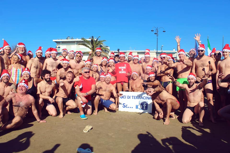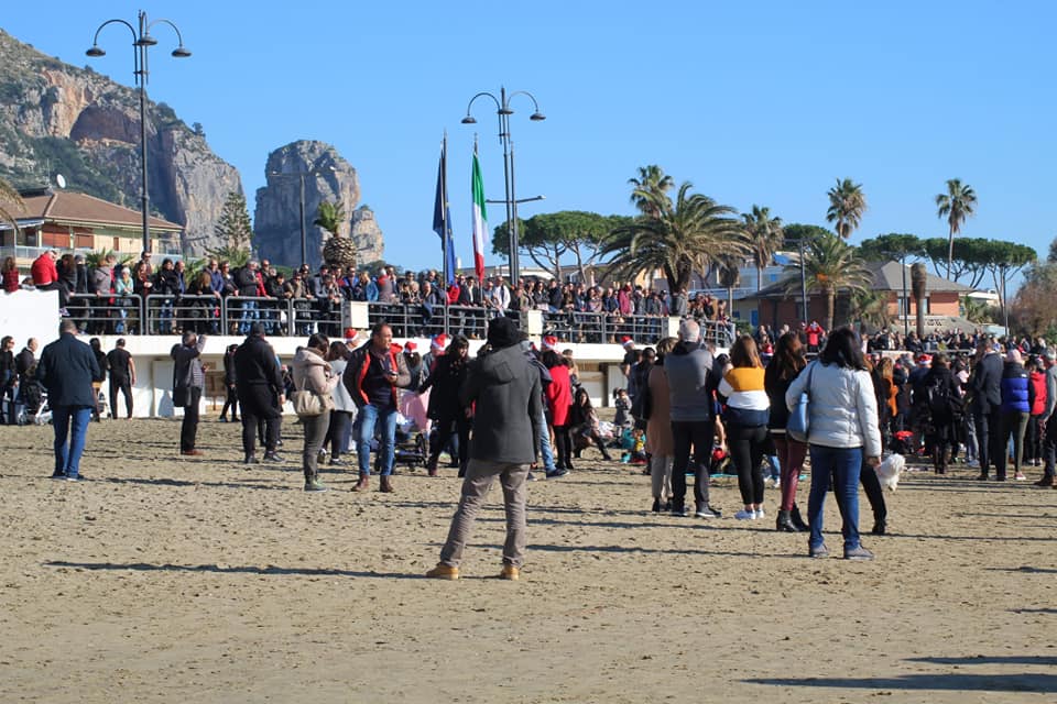 Tuffo di Santo Stefano a Terracina per aiutare il canile comunale. Costume da bagno e cappello da Babbo Natale questa mattina in spiaggia, all’ombra di Pisco Montano, per sfidare il freddo, ma non troppo grazie al sole che da ieri mitiga al temperatura.