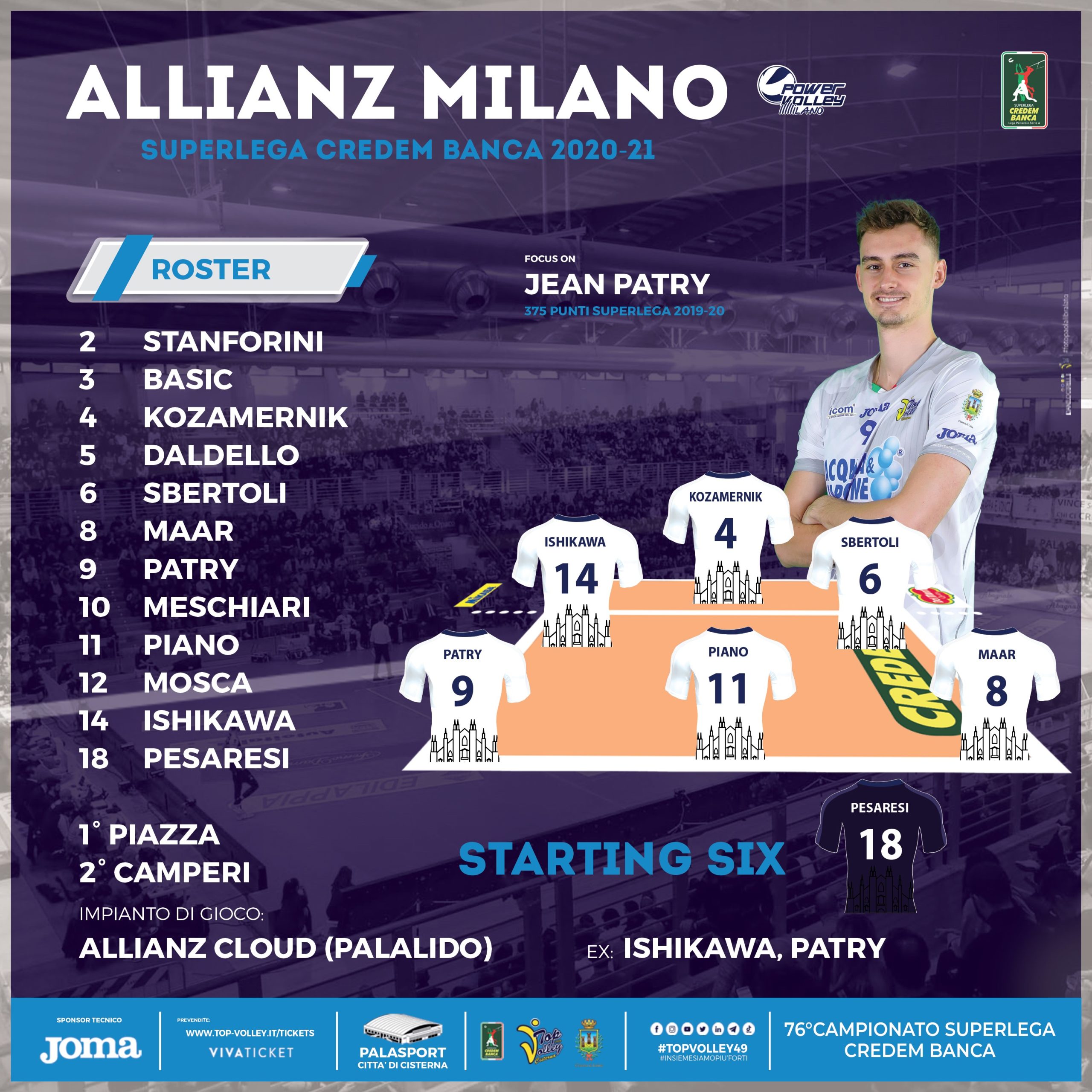 Il 27 settembre prossimo invece inizierà il campionato di Superlega Credem Banca e la Top volley Cisterna sarà impegnata a Milano contro l’Allianz degli ex Ishikawa e Patry. L’Allianz Milano riparte dal quinto posto in regular season dello scorso torneo, quello interrotto dal Covid-19, in cui i meneghini avevano totalizzato 36 punti con 12 vittorie e sette sconfitte, 40 set vinti e 29 persi, con una distanza di dieci punti dalla prima inseguitrice (Ravenna) e un +20 sulla Top volley. Coach Roberto Piazza verrà affiancato dal secondo Marco Camperi e l’Allianz Milano partirà con ambizioni importanti anche nel prossimo campionato, si segnala la partenza di Nimir Abdelaziz (a Trento), uno dei principali attaccanti della squadra, che è stato sostituto con Jean Patry (ex Top volley) al secondo anno in Italia. Milano ha cambiato anche con il canadese Stephen Maar e il giapponese Yuki Ishikawa (anche lui ex Top volley), due bande importanti per il torneo italiano. I centrali, Jan Kozamernik e Matteo Piano, sono due atleti molto forti a muro e hanno un’esperienza notevole, con Sbertoli in regia e Pesaresi (libero) che sono giocatori in grado di stare ad alto livello.