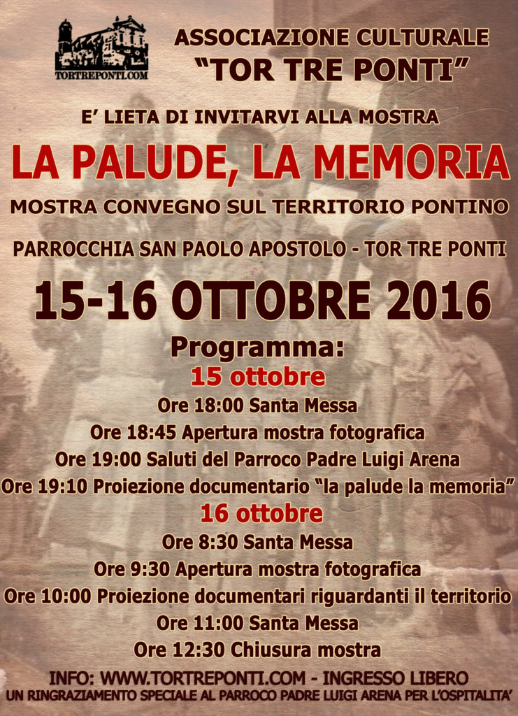 L’appuntamento è per sabato 15 e domenica 16 ottobre, presso il salone parrocchiale della chiesa di San Paolo Apostolo a Tor tre Ponti, dove l’associazione culturale Tor tre Ponti promuove la mostra “La palude, la memoria, ricordi e accadimenti dalla bonifica ad oggi”. Uno spaccato della storia del territorio pontino realizzato grazie alla raccolta nel tempo di numerose testimonianze e documenti fotografici in grado di ricostruire la quotidianità di una comunità alle prese con un territorio da bonificare.