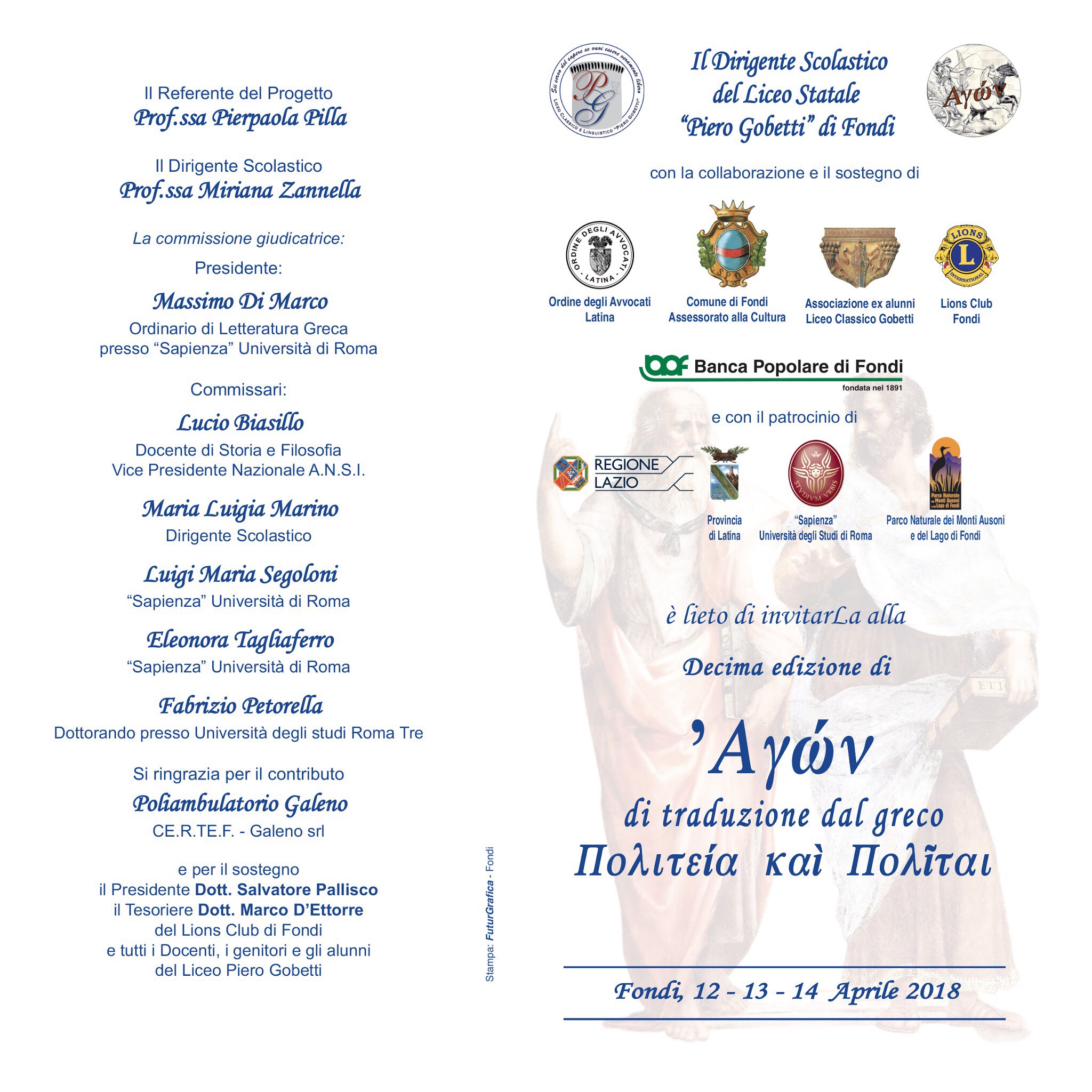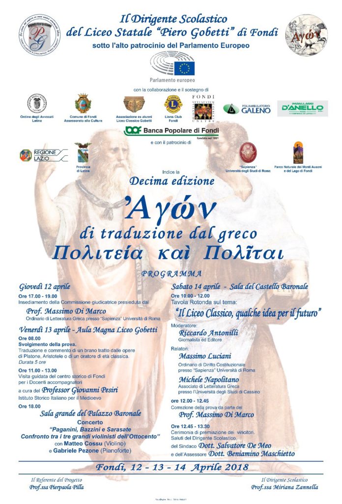 Dal 12 al 14 Aprile si svolgerà la decima edizione del Progetto dal titolo Agώn Gobetti, che vede la presenza a Fondi di studenti e docenti provenienti dai licei classici di diverse regioni d’Italia.