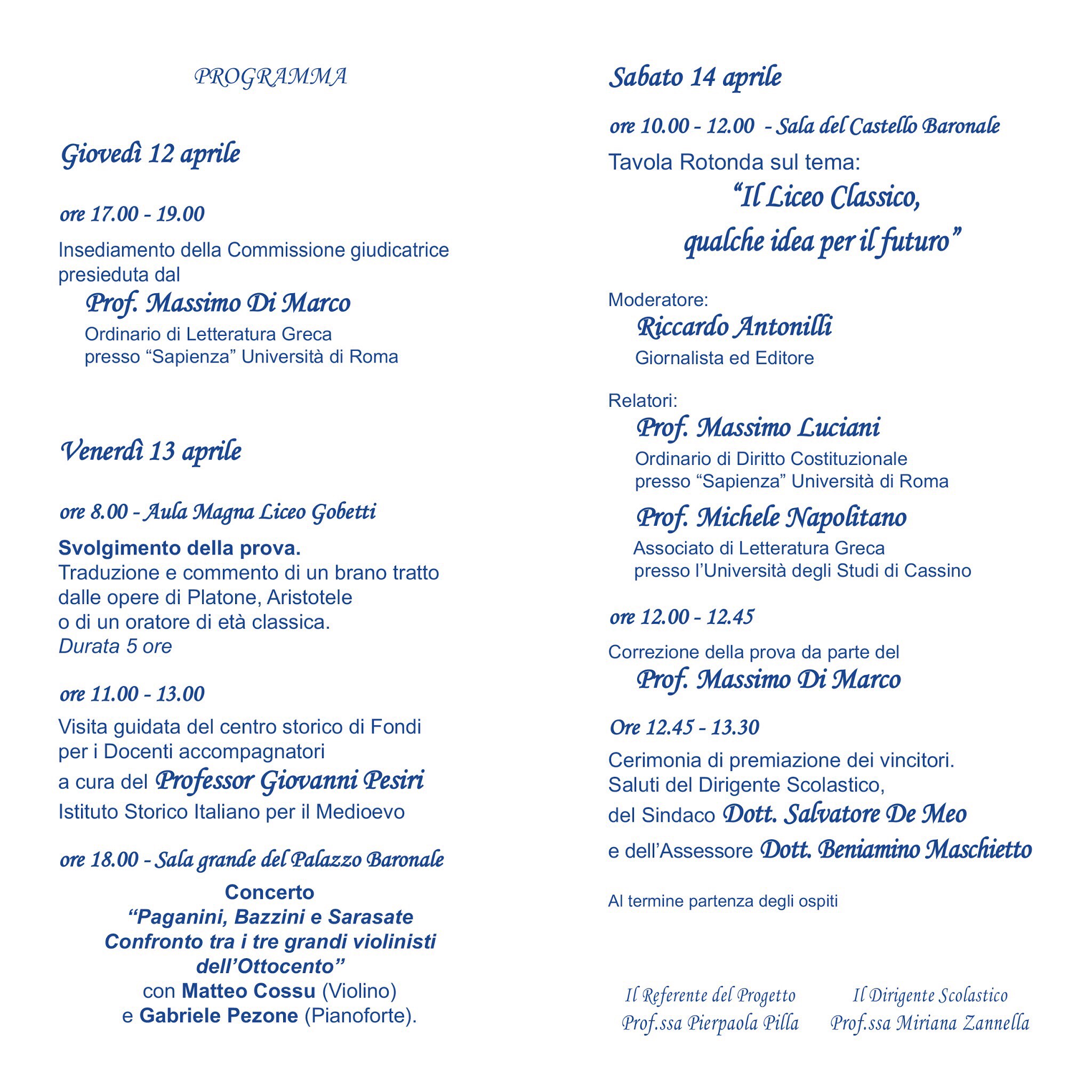 Sabato 14 aprile, poi, presso la Sala del Castello, dalle ore 10.00 alle ore 12.00 si terrà una tavola rotonda sul tema “Il Liceo Classico, qualche idea per il futuro”, moderata dal Giornalista e Editore Riccardo Antonilli; interverranno come relatori Massimo Luciani, Ordinario di Diritto Costituzionale presso “Sapienza” Università di Roma e Michele Napolitano, Associato di Letteratura Greca presso l’Università degli studi di Cassino. Alle ore 12.00 il Professor Massimo Di Marco procederà alla correzione del brano e, al termine, il Dirigente Scolastico concluderà con la cerimonia di premiazione dei vincitori della competizione, alla presenza del Sindaco Dott. Salvatore De Meo e dell’Assessore alla Cultura e alle Politiche della Scuola Dott. Beniamino Maschietto.