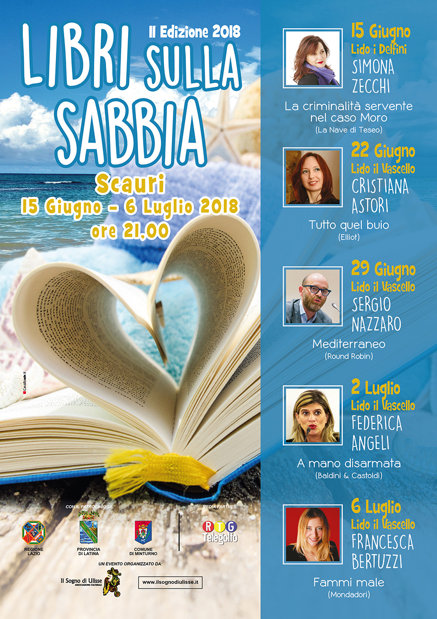 Dopo il successo della scorsa edizione, l’Associazione Culturale “Il Sogno di Ulisse” ripropone anche quest’anno “Libri sulla sabbia”, rassegna letteraria alla sua seconda edizione che si svolgerà a Scauri dal 15 giugno al 6 luglio presso i lidi “I Delfini” e “Il Vascello”, mirando ad essere un appuntamento culturale estivo che intende coinvolgere la cittadinanza locale, i turisti e i Comuni limitrofi.