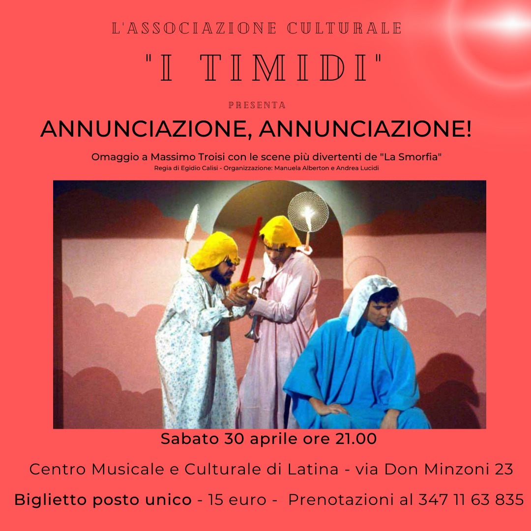 E’ dedicato agli sketch più celebri del gruppo comico “La Smorfia”, lo spettacolo che l’associazione culturale “I Timidi” metterà in scena, per la prima volta a Latina, il prossimo 30 Aprile alle 21.