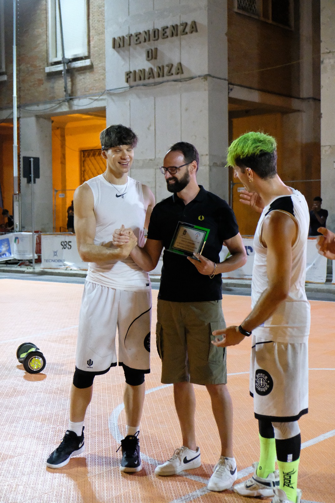 Il gran finale è stato affidato agli Space Jumpers, al secolo Skyone (Salvo) e Mr Jump (Marco), protagonisti del dunk show che ha lasciato il pubblico senza fiato. Acrobazie, schiacciate e interazione col pubblico hanno trasformato il campo in un’arena spettacolare. “Abbiamo iniziato nel 2018, da un campetto a Milano, oggi giriamo l’Europa portando la nostra passione ovunque”, hanno raccontato. Al termine dello show, una vera e propria invasione di bambini e ragazzi per chiedere autografi. I due dunker sono stati premiati con una targa da Luca Rizzi, direttore tecnico del BiP e delegato FIP.
