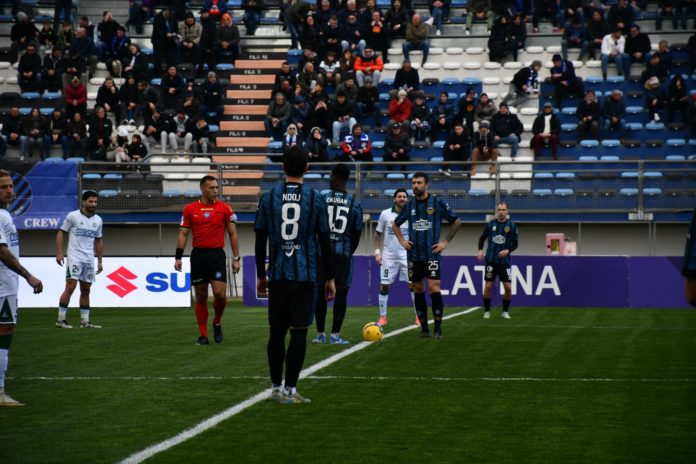 La partita si sblocca subito, già al 15 minuto: Cosimo Patierno, insacca di testa su un perfetto assist di Dimitrios Sounas e apre le danze per la formazione ospite. Il Latina, in un clima rovente, prova a reagire, sfiorando il pari al 22’ con Ekuban, che colpisce la traversa complice una decisiva deviazione di Iannarilli. Lo stesso portiere biancoverde si supera un minuto dopo, negando ancora il gol all’attaccante avversario.