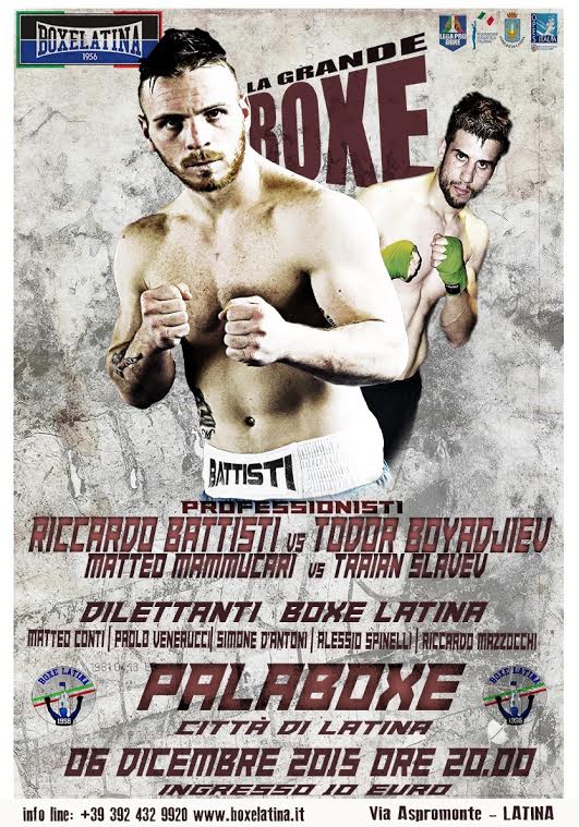 Cresce l’attesa al Palaboxe “Città di Latina” per la grande serata di pugilato organizzata per domenica a partire dalle 20. Il programma prevede un confronto Italia – Bulgaria e una riunione mista organizzata dalla Asd Boxe Latina ad un passo dal traguardo dei 60 anni di attività. L’evento di richiamo è sicuramente l’esordio nei professionisti del peso superleggero (kg 63.500) Riccardo “Binario” Battisti, 27 anni, pronto a iniziare la strada che porta al titolo italiano della categoria. Il collaudo è con Todor Boyadjiev, bulgaro di caratura internazionale che da subito testerà le qualità del pugile setino.