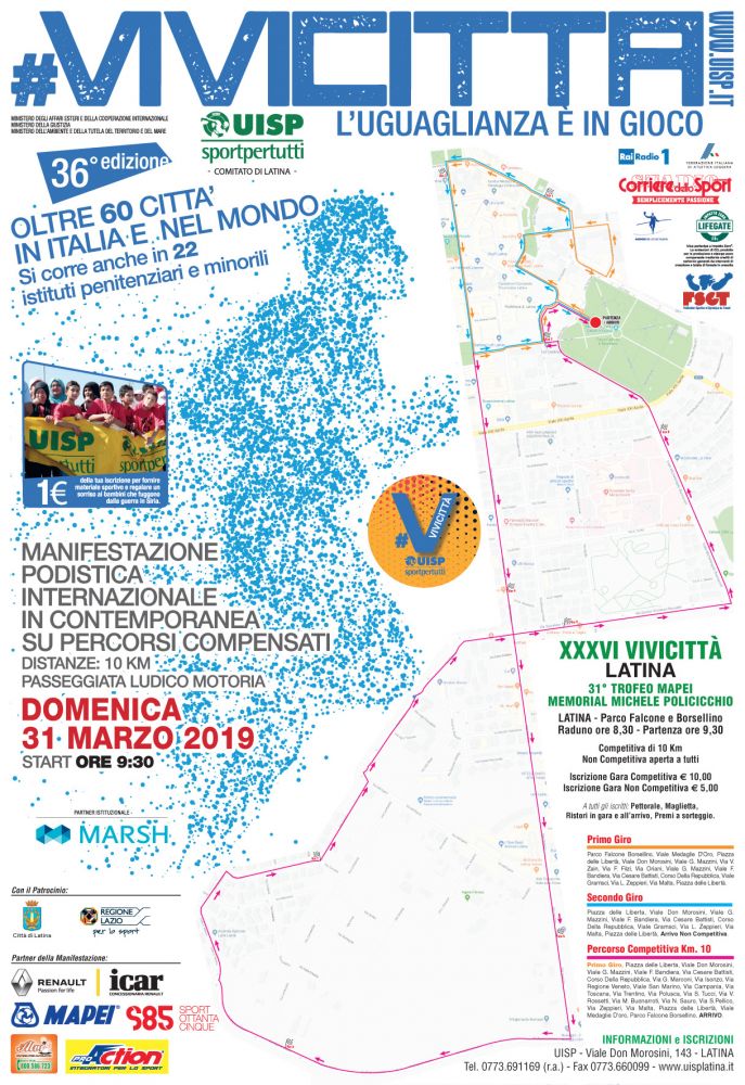 Lo start ufficiale della manifestazione sarà dato in contemporanea in tutte le città italiane in diretta su Radio 1 Rai. A Latina provvederà a dare il via il sindaco Damiano Coletta, sempre vicino agli eventi Uisp: “”Da oltre 30 anni Vivicittà anima le strade di Latina con energia e passione. Ormai questa manifestazione fa parte della storia della nostra città e per me è motivo di grande orgoglio poter presenziare alla partenza della “corsa più grande del mondo”. È un bel momento di festa e di condivisione che coinvolge tantissime persone, perché unisce la sana competizione sportiva allo svago e al divertimento. E come sempre conserva la sua vocazione solidaristica. Fare sport fa bene, lo dico da primo cittadino, da sportivo e da medico. Fa bene a se stessi e, come nel caso di Vivicittà, anche agli altri”.