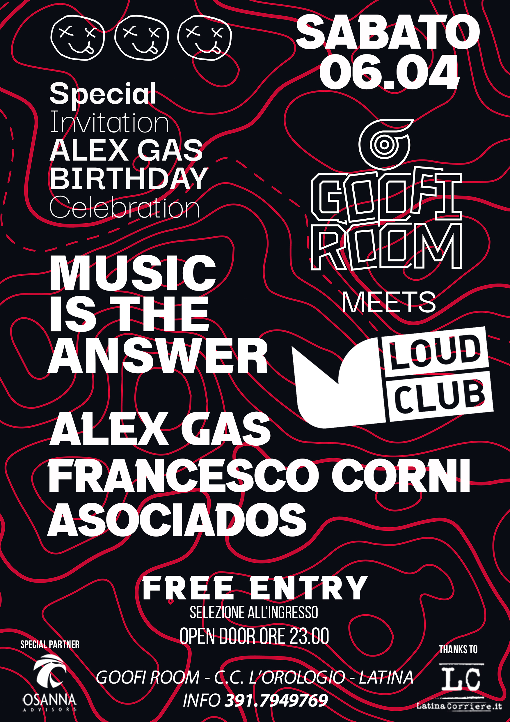 Sabato 6 Aprile, gli appassionati della musica elettronica avranno la possibilità di vivere un’esperienza straordinaria immersi in una notte di pura energia e ritmi avvincenti presso il Goofi Room di Latina. Questo evento segna l’incontro tra due giganti della nightlife, Goofi Room e il rinomato locale Loud Bar. Preparatevi a lasciarvi trasportare in un mix di suoni coinvolgenti, con la presenza dei dj Francesco Corni, Alex Gas e Asociados pronti a farvi ballare fino all’alba.