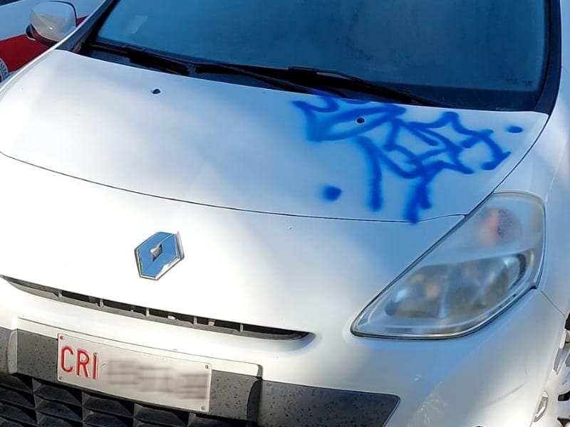 Al termine del corso qualche vandalo ha imbrattato la carrozzeria di due auto parcheggiate nelle vicinanze della sede C.R.I. di via Aldo Moro 31, nel quartiere San Valentino con scritte e scarabocchi utilizzando una bomboletta spray.