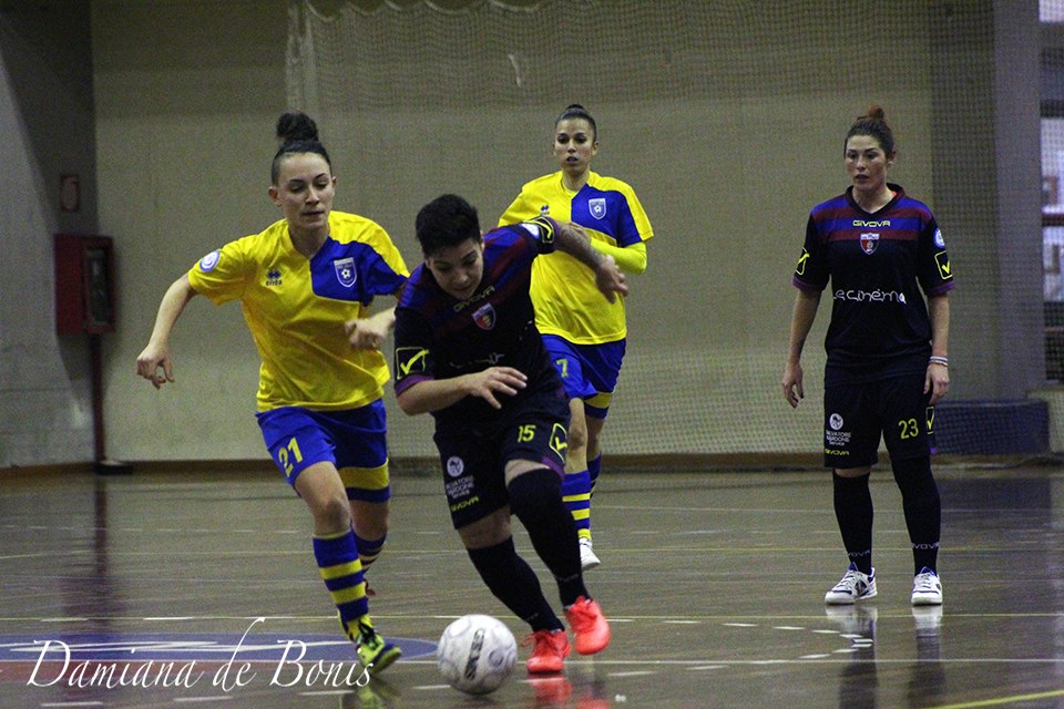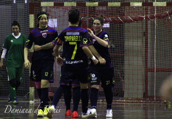 Ci doveva essere la partita del riscatto e c’è stata. La Vis Fondi femminile batte il Nazareth, squadra romana, per 5 a 1 tra le mura di casa. Seconda vittoria di stagione per le fondane, che chiudono il girone d’andata del campionato di serie A2 femminile di calcio a 5 nell’unico modo possibile. La squadra di mister Cibelli non aveva altra scelta, visto il bruttissimo avvio e i pochissimi punti in classifica. Il tecnico prima dell’incontro era stato chiaro, non si può più sbagliare, come tante volte in questi mesi è stato fatto, ed evidentemente le sue ragazze lo hanno finalmente recepito. Quasi impeccabile la partita delle rossoblu che non hanno permesso, come è spesso capitato, di far materializzare il famoso blackout iniziale. La Vis ha combattuto fin da subito su tutti i palloni. Ciò nonostante sono state le romane ad andare in vantaggio, sempre per una sorta di harakiri delle rossoblu. Ma, contrariamente al passato, spinte da un pubblico sempre caloroso, con in testa i tifosi BullDog, le padrone di casa hanno da prima pareggiato i conti e poi dilagato. Anzi, senza qualche egoismo di troppo, lo score sarebbe potuto essere di gran lunga superiore. Le reti sono state di Sofia Azevedo (in foto sopra con Federica Marzi) che ha così ristabilito la parità, e poi una tripletta di Federica Marzi, e il primo goal in rossoblu della giapponese Ai Haruyama. Migliore in campo il capitano Jessica Zomparelli, con una bellissima prestazione. Da sottolineare anche l’ottima partita del nuovo portiere Giorgia Zavettieri e della giovanissima Francesca Capodiferro, una delle poche atlete del territorio in forza alla Vis, che ha giocato diversi sprazzi di partita con una eloquenza e una maestria da giocatrice navigata. Durante l’incontro c’è stata anche la possibilità di rivedere in campo Alessandra Waldy Monforte e Giulia Popolla che, durante la prima parte di stagione erano in prestito ad una squadra di serie d, e che ora sono ritornate a casa. Si smuove finalmente la classifica per la Vis, infatti il team si porta al 9° posto in attesa di incontrare domenica 21 gennaio, il campionato riposa domenica 14, per l’inizio del girone di ritorno il PMB Futsal, sempre in casa al palazzetto dello sport di Fondi. Radio ufficiale del team: Radio Show Italia. Ascoltala sulla app, oppure su www.radioshowitalia.it. Il campionato della Vis Fondi è reso possibile anche grazie alla collaborazione di Imballaggi Fidaleo e Le Cinèma, Fondi.