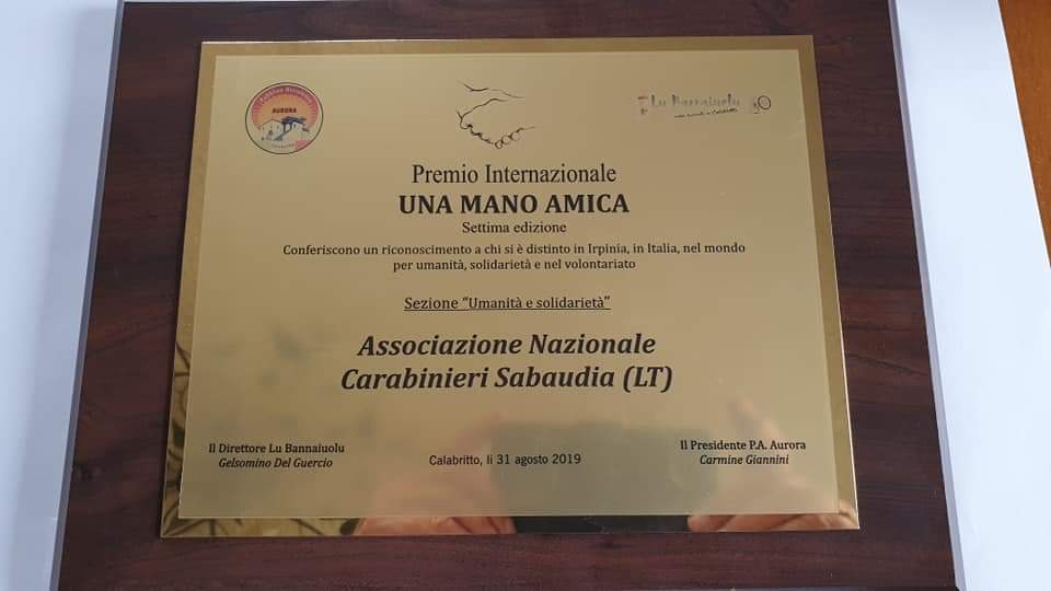 L’Associazione nazionale carabinieri di Sabaudia ha ricevuto, domenica scorsa a Calabritto (Avellino), il premio “Umanità e solidarietà”.